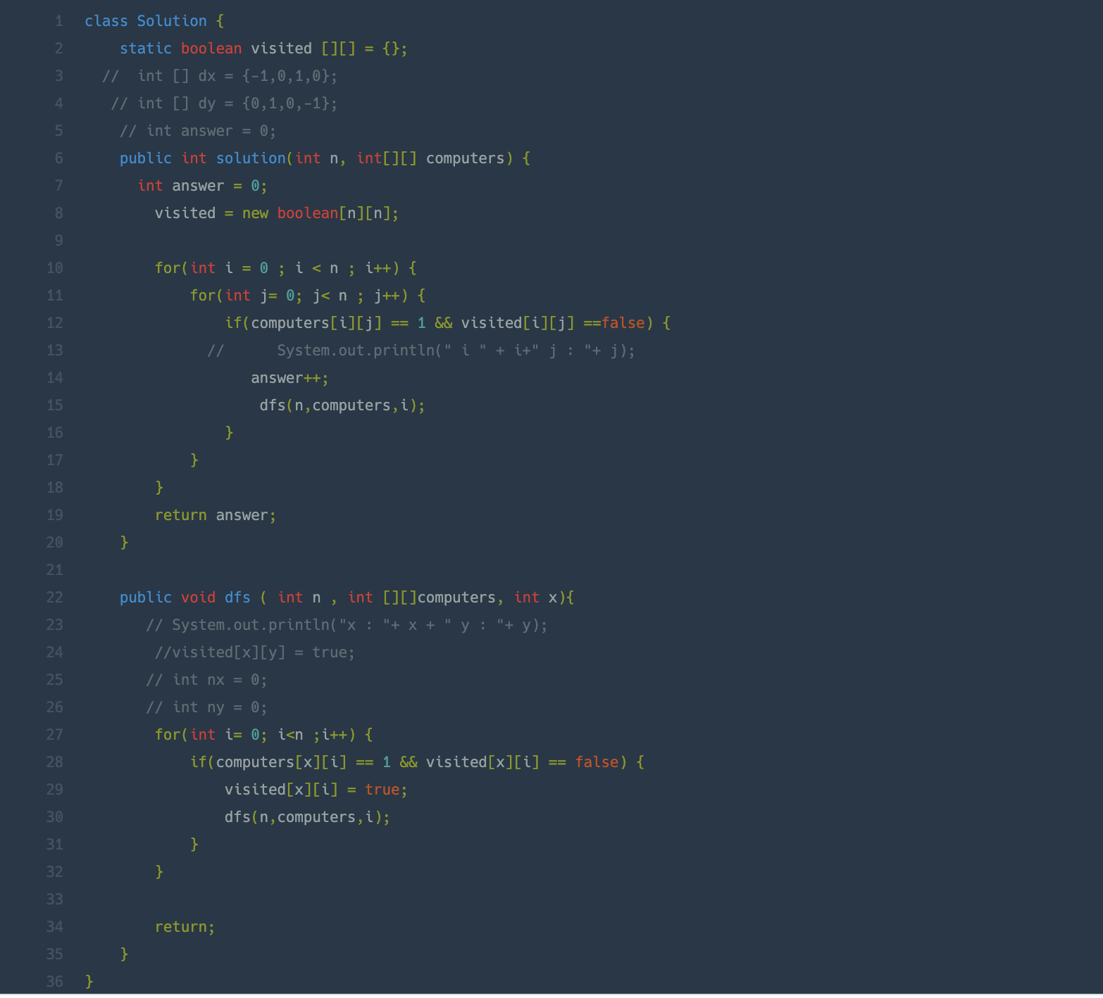 https://programmers.co.kr/learn/courses/30/lessons/1829 import java.util.*; import java.math.*; class Solution { static class Node{ int x; int y; public Node(int x, int y) { this.x= x; this.y=y; } } int dx [] = {-1,0,1,0}; int dy [] = {0,1,0,-1}; boolean visited [][]= {}; public int[] solution(int m, int n, int[][] picture) { int numberOfArea = 0; int maxSizeOfOneArea = 0; visited = new boolean ..
